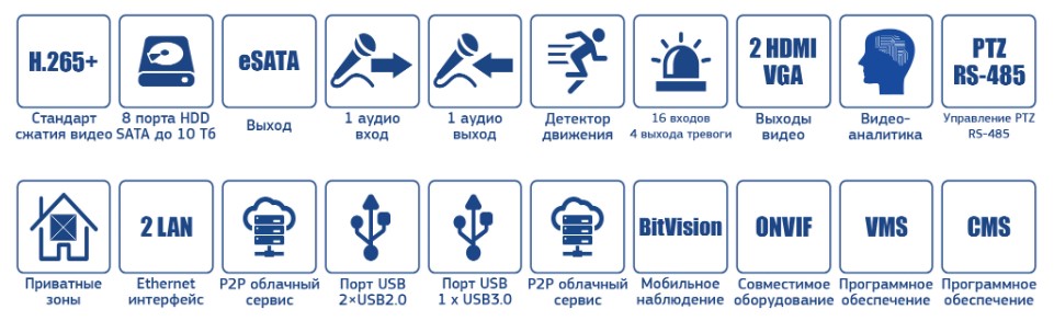 Запись 1Мп (1280х720) до 64 IP камер, отображение 64, воспроизведение 16