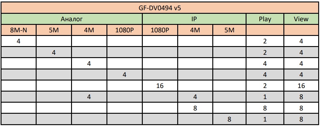 Аналог: 4*8M-N 7fps; 4*5M 6fps; 4*4M 8fps; 4*1080P 15fps; 4*4М (аналог) + 4*4М (ip); Режим Пользователя (произвольный выбор)