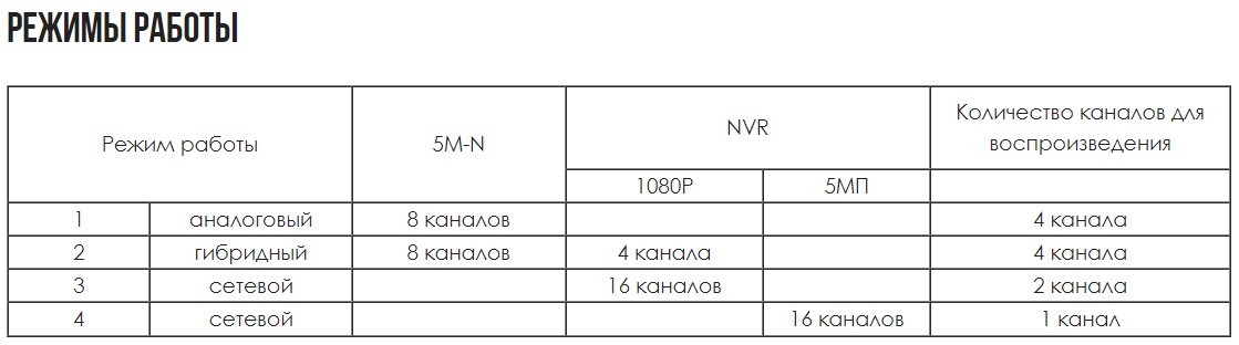 Аналоговый режим    8 камер 5M-N/ 4M-N / 720P AHD/TVI/CVI/XVI / CVBS 960Н