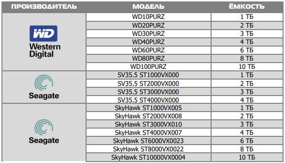 Лучше использовать специальные жёсткие диски из списка рекомендуемых. Это может помочь избежать множества проблем и увеличить ресурс их работы в составе системы видеонаблюдения.