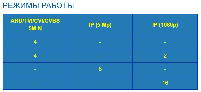 Максимально подключается камер 4(AHD,TVI,CVI,CVBS) до 5Mp/ 8 IP 5Mp/ 16 IP 2Mp
